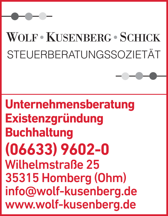 Die Adresse von Wolf Kusenberg Schick Steuerberatungssozietät lautet: Wilhelmstr. 25, 35315 Homberg (Ohm)
