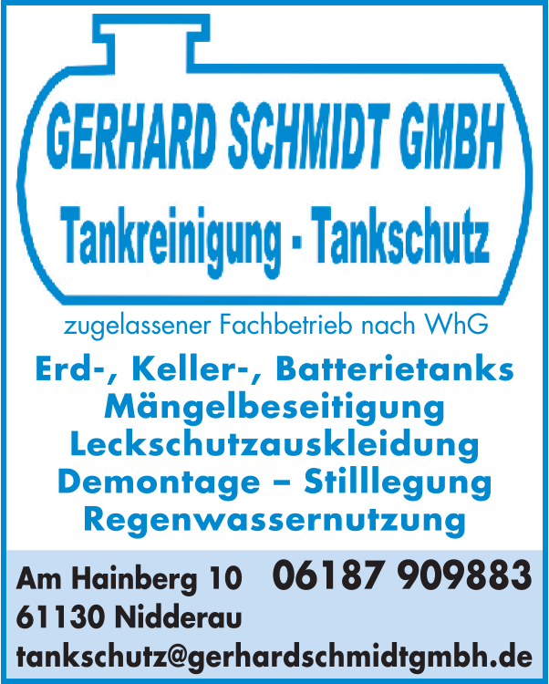 Die Adresse von Gerhard Schmidt GmbH Tankreinigung lautet: Am Hainberg 10, 61130 Nidderau
