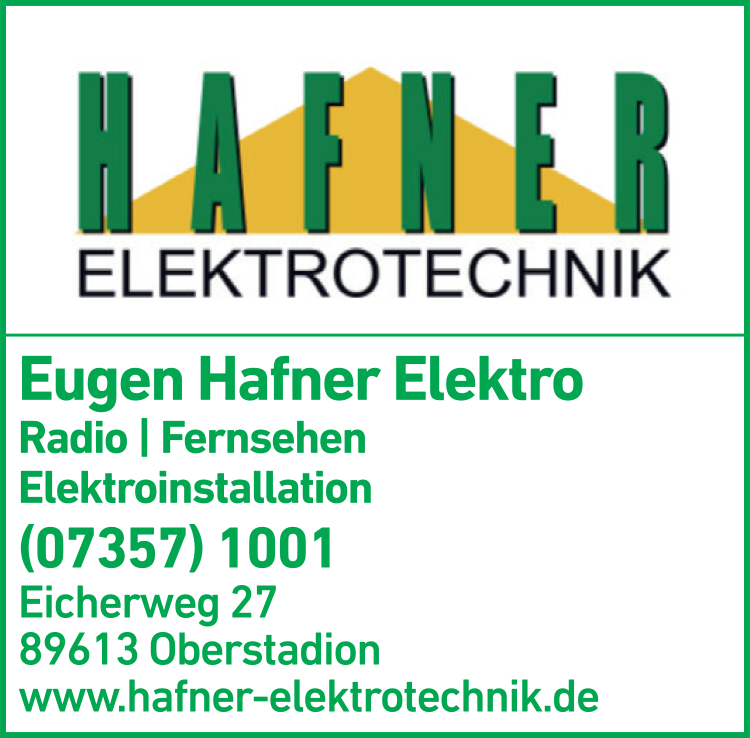 Die Adresse von Hafner Eugen Elektrotechnik lautet: Eicherweg 27, 89613 Oberstadion