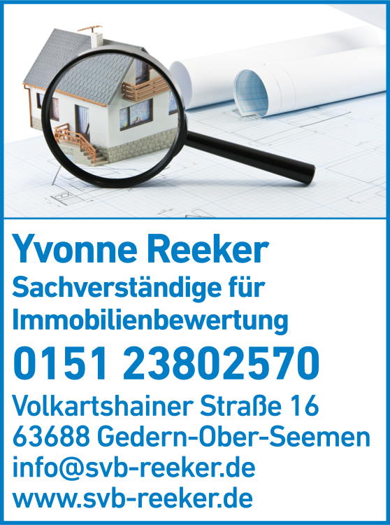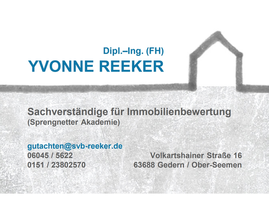 Die Adresse von Reeker Yvonne Dipl. - Ing. (FH) Sachverständige lautet: Volkartshainer Str. 16, 63688 Gedern-Ober-Seemen