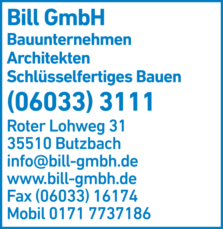 Die Adresse von Bill Bauunternehmung GmbH Bauunternehmung u. Architekten lautet: Roter Lohweg 31, 35510 Butzbach
