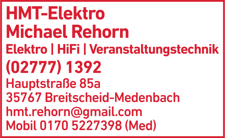 Die Adresse von HMT-Elektro Rehorn Michael lautet: Hauptstr. 85 a, 35767 Breitscheid