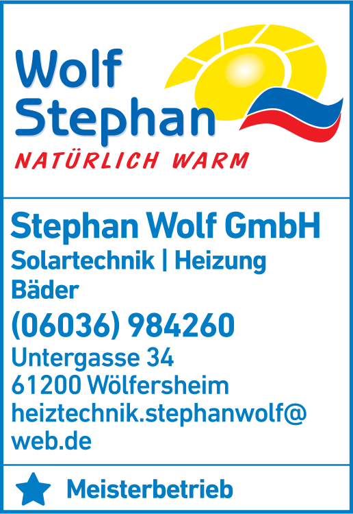 Die Adresse von Stephan Wolf GmbH Solar & Heizung lautet: Untergasse 34, 61200 Wölfersheim