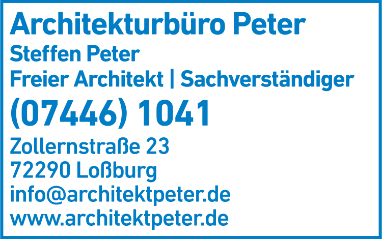 Die Adresse von Peter Steffen Freier Architekt lautet: Zollernstr. 23, 72290 Loßburg