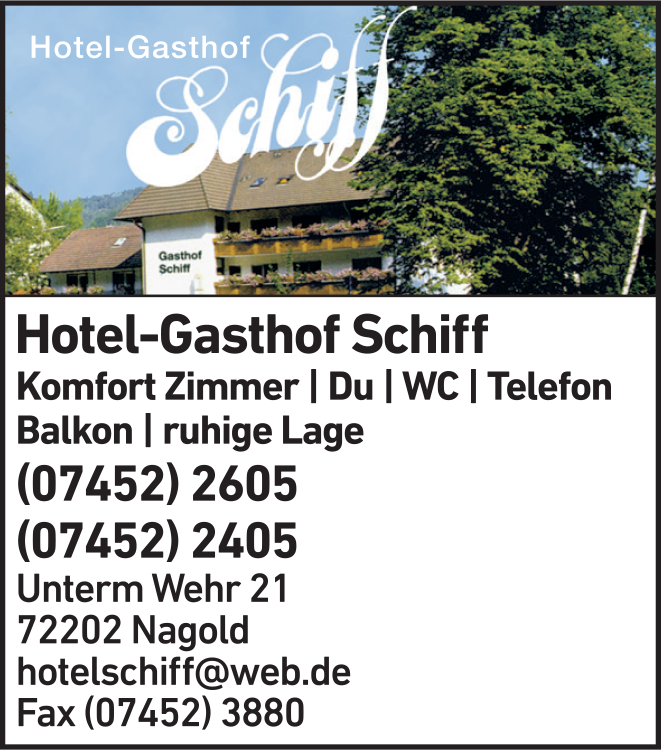 Die Adresse von Hotel-Gasthof Schiff lautet: Unterm Wehr 19, 72202 Nagold