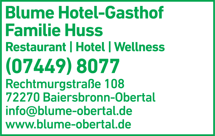 Die Adresse von Blume Hotel-Gasthof lautet: Rechtmurgstr. 108, 72270 Baiersbronn
