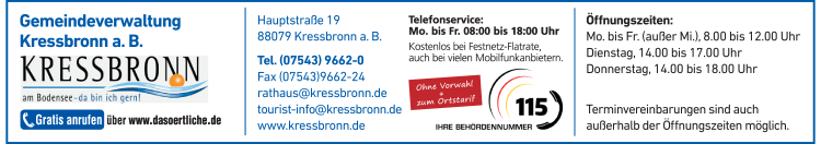 Wie sind die Öffnungszeiten von Gemeindeverwaltung Kressbronn?