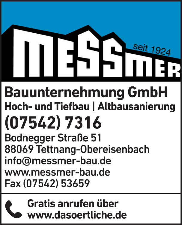 Die Adresse von Messmer Bauunternehmung GmbH lautet: Bodnegger Str. 51, 88069 Tettnang