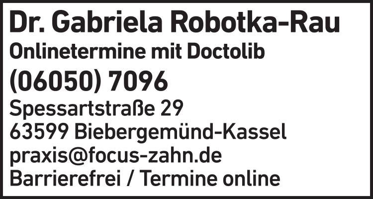 Wie lautet die Adresse von Dr. Gabriela Robotka-Rau - focus-zahnarzt.de Zahnärztin?