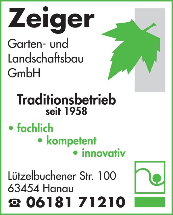 Die Adresse von Zeiger Garten- und Landschaftsbau GmbH lautet: Lützelbuchener Str. 100, 63454 Hanau