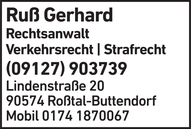 Die Adresse von Ruß Rechtsanwalt lautet: Lindenstr. 20, 90574 Roßtal