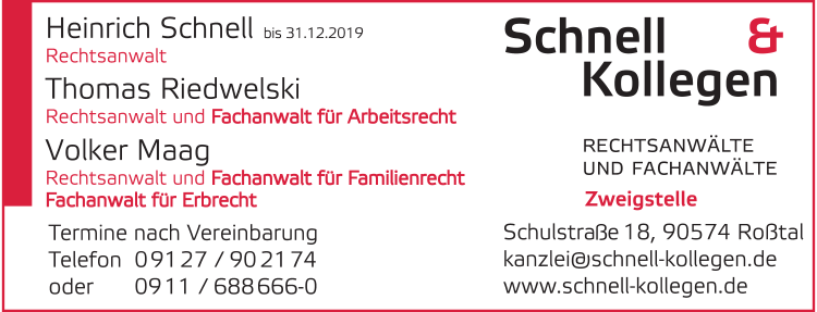 Die Adresse von Schnell & Kollegen Rechtsanwälte lautet: Schulstr. 18, 90574 Roßtal