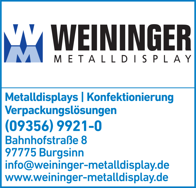Die Adresse von Weininger Metalldisplay GmbH lautet: Bahnhofstr. 8, 97775 Burgsinn