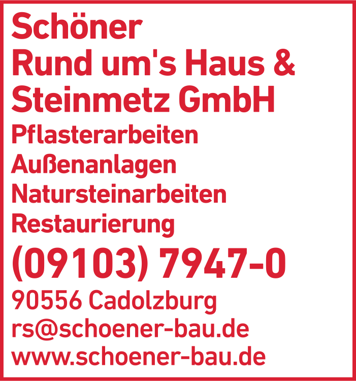 Die Adresse von Schöner Rund um's Haus u. Steinmetz GmbH lautet: 90556 Cadolzburg