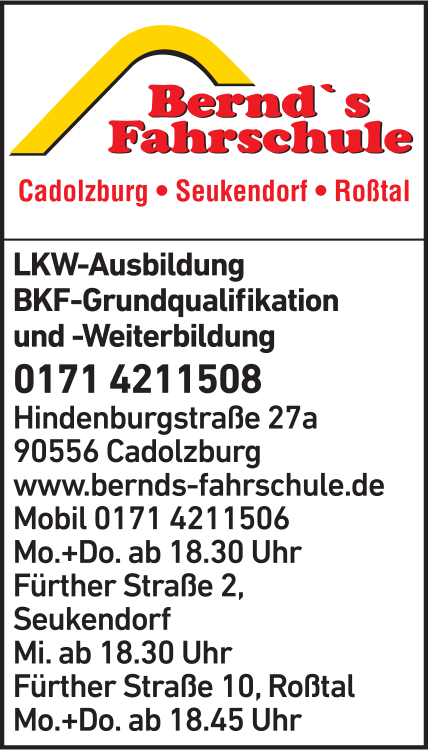 Die Adresse von Bernd's Fahrschule Ferienfahrschule lautet: Hindenburgstr. 27 a, 90556 Cadolzburg