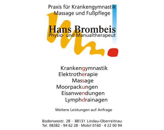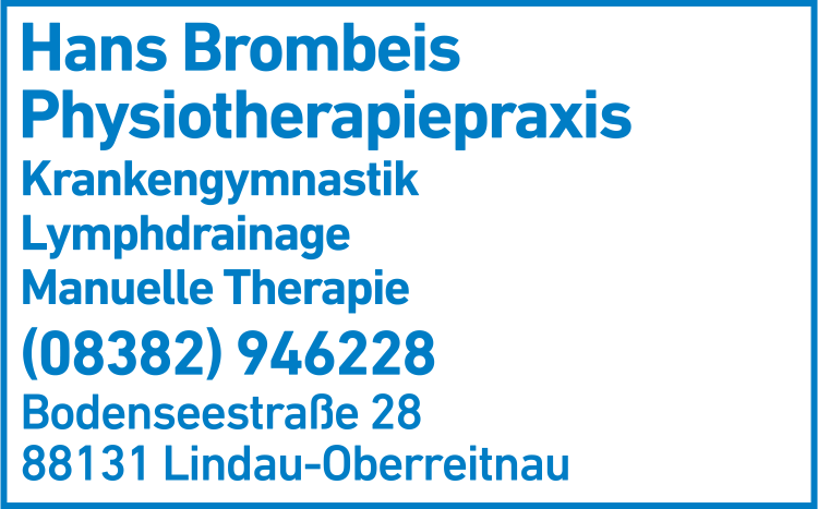Die Adresse von Brombeis Hans Krankengymnastikpraxis lautet: Bodenseestr. 28, 88131 Lindau