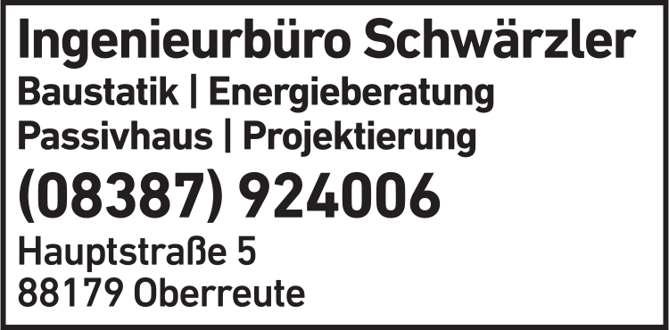 Die Adresse von Ingenieurbüro Schwärzler Bauingenieur lautet: Hauptstr. 5, 88179 Oberreute