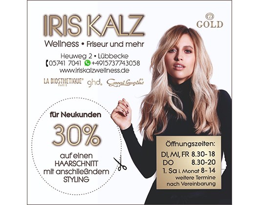 Die Adresse von Kalz Iris Welness Friseur und mehr.. lautet: Heuweg 2, 32312 Lübbecke