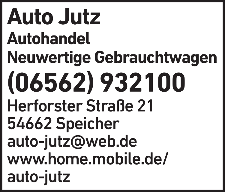 Die Adresse von Auto Jutz Autohandel lautet: Herforster Str. 21, 54662 Speicher
