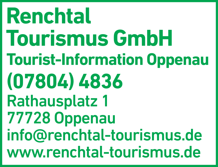 Die Adresse von Renchtal Tourismus GmbH lautet: Rathausplatz 1, 77728 Oppenau