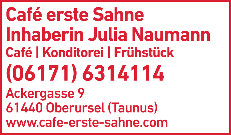 Die Adresse von Café erste Sahne lautet: Ackergasse 9, 61440 Oberursel (Taunus)