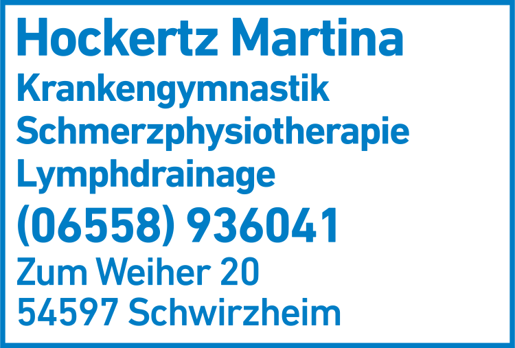 Die Adresse von Hockertz Martina Krankengymnastik lautet: Zum Weiher 20, 54597 Schwirzheim