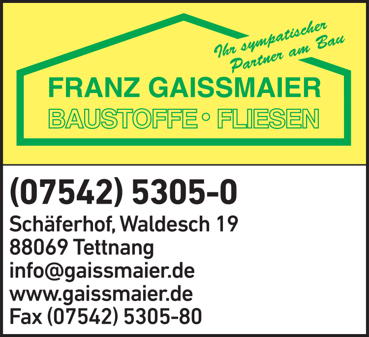 Die Adresse von Gaissmaier Franz GmbH & Co. KG Baustoffe - Fliesen lautet: Waldesch 19, 88069 Tettnang