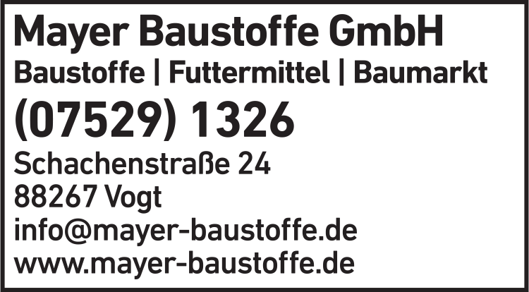 Die Adresse von Mayer Baustoff- und Landesprodukten GmbH lautet: Schachenstr. 24, 88267 Vogt