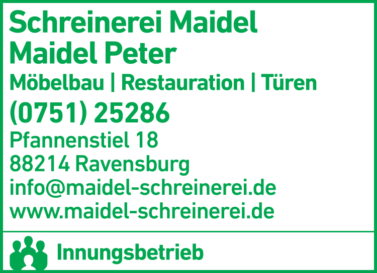 Die Adresse von Maidel Peter Schreinerei lautet: Pfannenstiel 18, 88214 Ravensburg