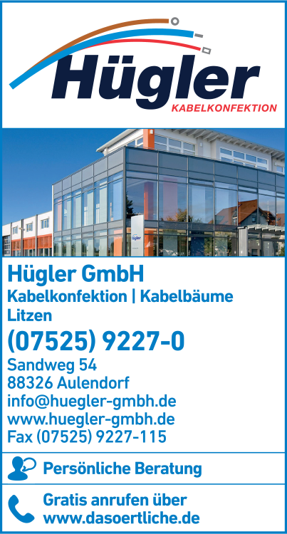 Die Adresse von Hügler GmbH Kabelkonfektion lautet: Sandweg 54, 88326 Aulendorf