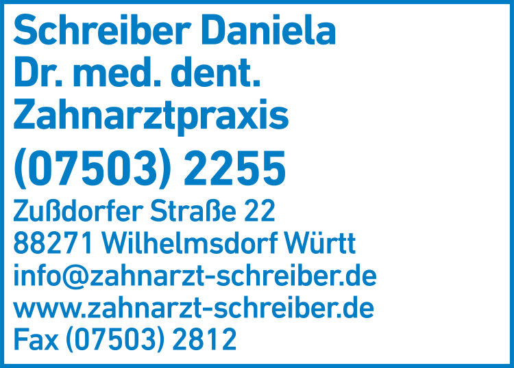Schreiber Daniela Zahnarztpraxis 07503 22 55 Wilhelmsdorf Zußdorfer Str. 22 88271 5 5 1