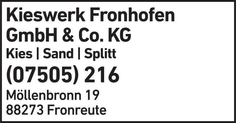 Die Adresse von Kieswerk Fronhofen GmbH & Co. KG lautet: Möllenbronn 19, 88273 Fronreute