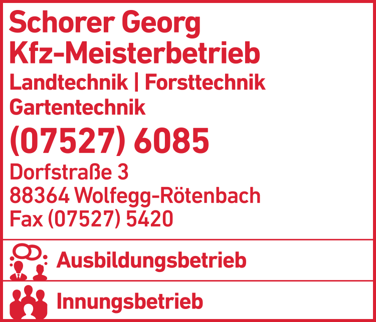 Die Adresse von Schorer Georg Landmaschinen, KFZ-Technik, Landtechnik, Gartentechnik lautet: Dorfstr. 3, 88364 Wolfegg