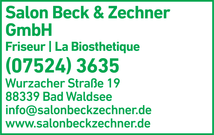 Die Adresse von Salon Beck & Zechner GmbH lautet: Wurzacher Str. 19, 88339 Bad Waldsee