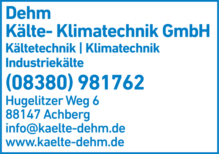 Die Adresse von Dehm Kälte - Klimatechnik GmbH lautet: Hugelitzer Weg 6, 88147 Achberg