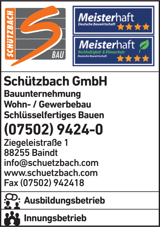 Die Adresse von Schützbach GmbH Bauunternehmung lautet: Ziegeleistr. 1, 88255 Baindt