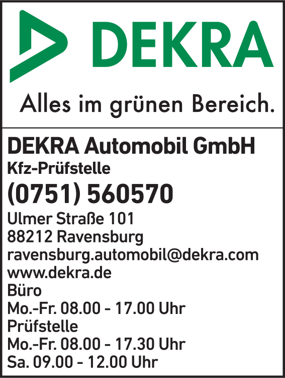 Die Adresse von DEKRA Automobil GmbH lautet: Ulmer Str. 101, 88212 Ravensburg