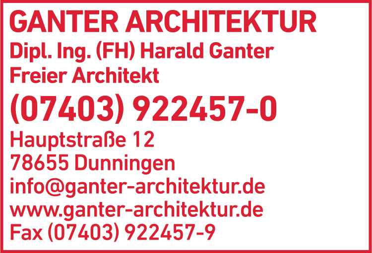 Die Adresse von GANTER ARCHITEKTUR lautet: Hauptstr. 12, 78655 Dunningen