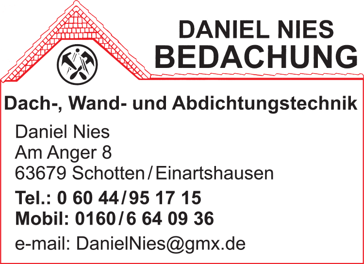 Die Adresse von Nies Daniel Bedachungen lautet: Am Anger 8, 63679 Schotten-Einartshausen