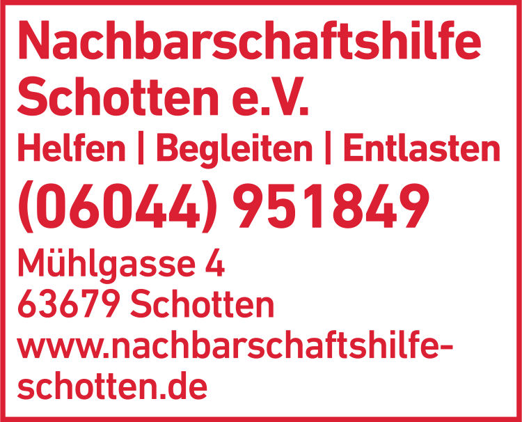 Die Adresse von Nachbarschaftshilfe Schotten e.V. lautet: Mühlgasse 4, 63679 Schotten