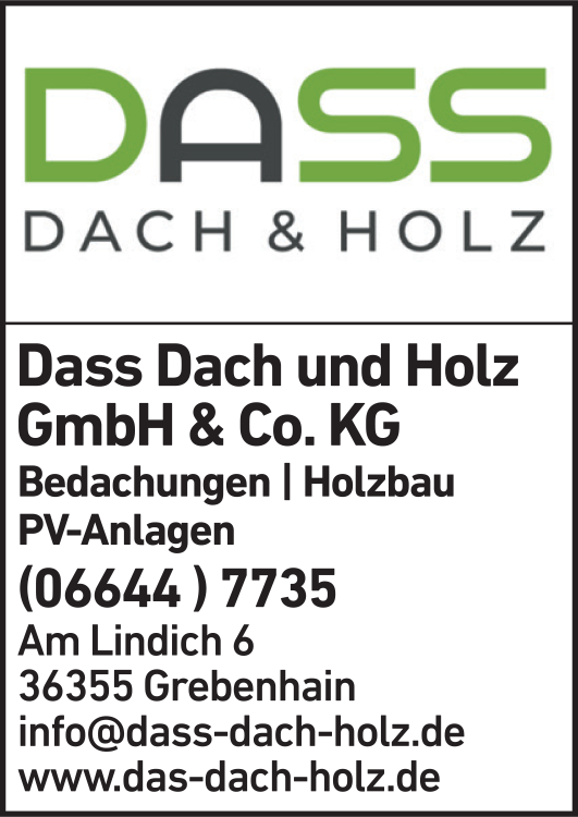 Die Adresse von Dass Dach und Holz GmbH & Co. KG lautet: Am Lindich 6, 36355 Grebenhain
