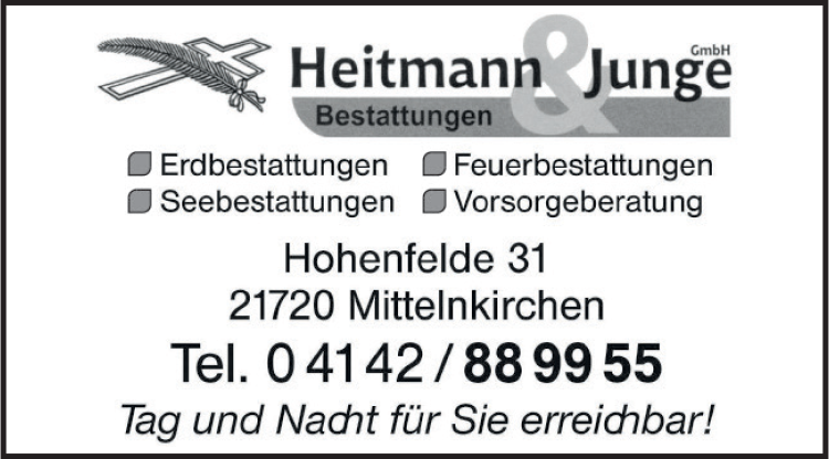 Die Adresse von Heitmann & Junge GmbH Bestattungen lautet: Hohenfelde 31, 21720 Mittelnkirchen
