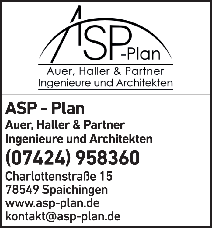 Die Adresse von ASP-Plan Auer, Haller & Partner Ingenieure & Architekten lautet: Charlottenstr. 15, 78549 Spaichingen