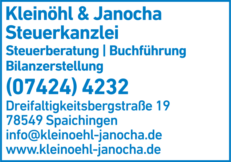 Die Adresse von Steuerkanzlei Kleinöhl & Janocha lautet: Dreifaltigkeitsbergstr. 19, 78549 Spaichingen