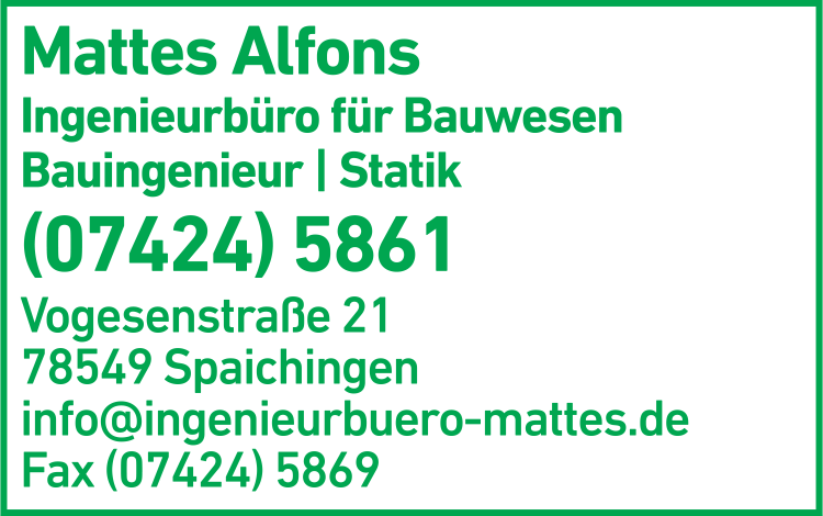 Die Adresse von Mattes Alfons Ingenieurbüro lautet: Vogesenstr. 21, 78549 Spaichingen