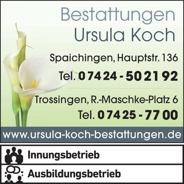 Die Adresse von Koch Ursula Bestattungen Bestattungsinstitut lautet: Rudolf-Maschke-Platz 6, 78647 Trossingen