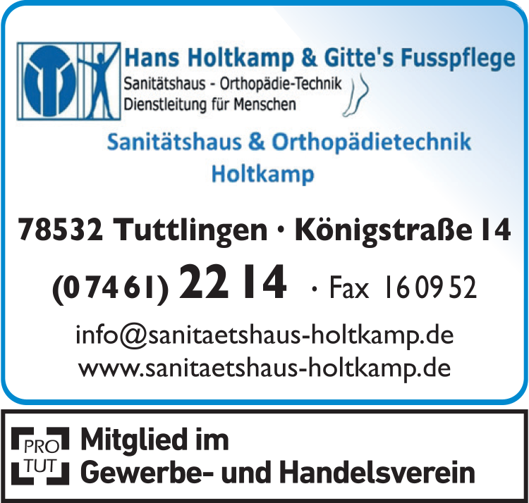 Die Adresse von Holtkamp Orthopädietechnik lautet: Königstr. 14, 78532 Tuttlingen