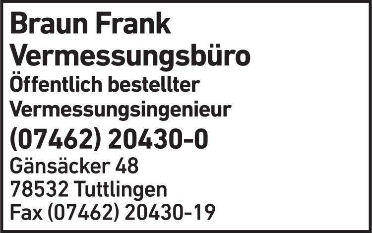 Die Adresse von Braun Frank Vermessungsbüro lautet: Gansäcker 48, 78532 Tuttlingen