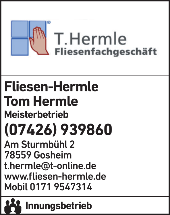 Die Adresse von Hermle Tom Fiesenlegermeisterbetrieb lautet: Am Sturmbühl 2, 78559 Gosheim