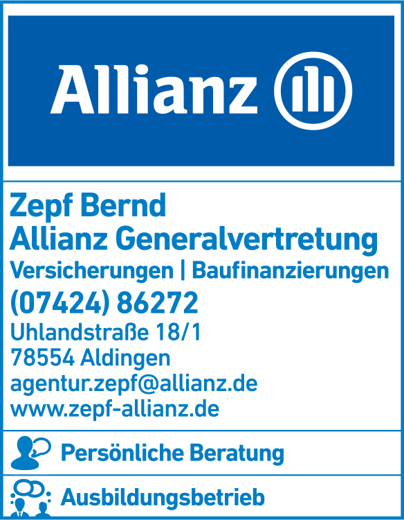 Die Adresse von Zepf Bernd Allianz Generalvertretung lautet: Uhlandstr. 18, 78554 Aldingen